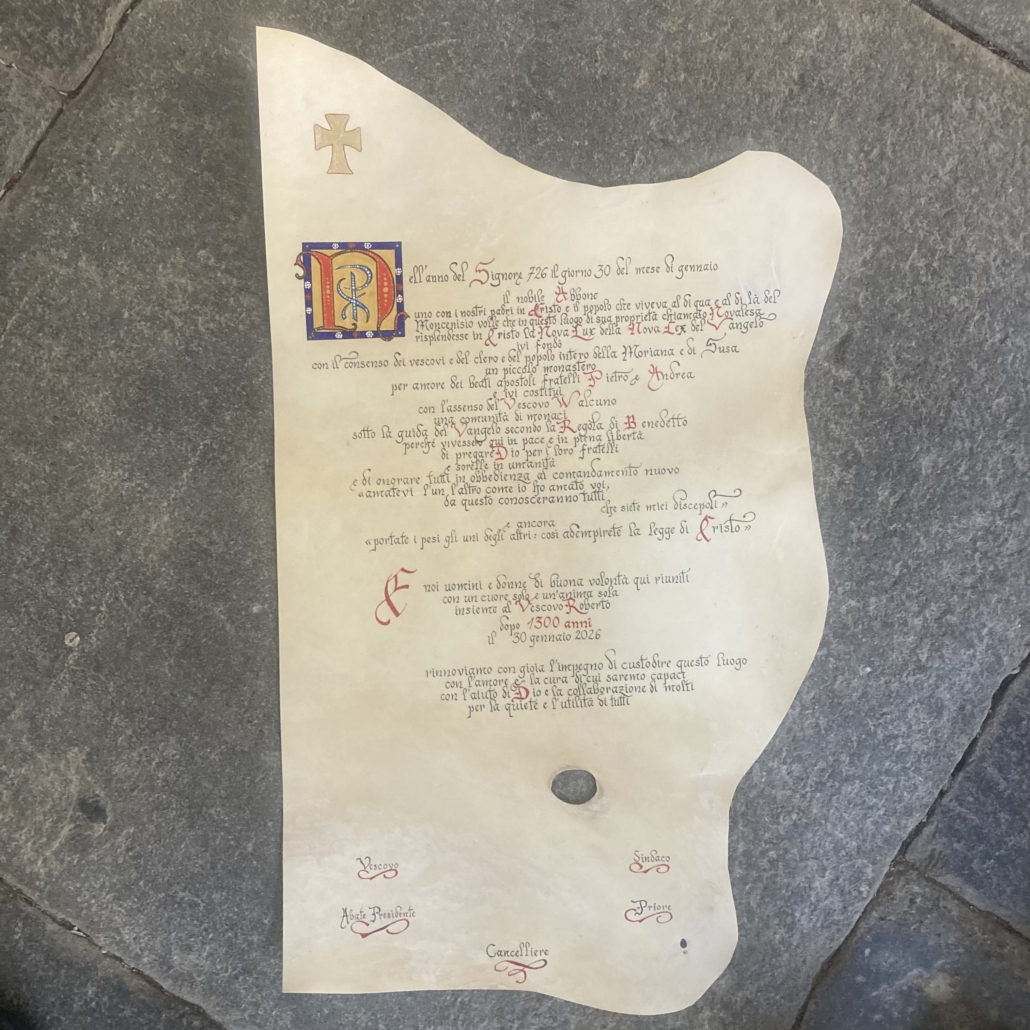 Durante la cerimonia è stato rinnovato l’impegno a conservare l’abbazia, mantenendola come luogo di pace e di accoglienza: il cardinale Repole, il sindaco Lo Russo, il priore Michael David Semeraro, l’abate presidente della Congregazione Benedettina Ignasi Fossas e don Gianluca Popolla hanno sottoscritto una pergamena di rifondazione.